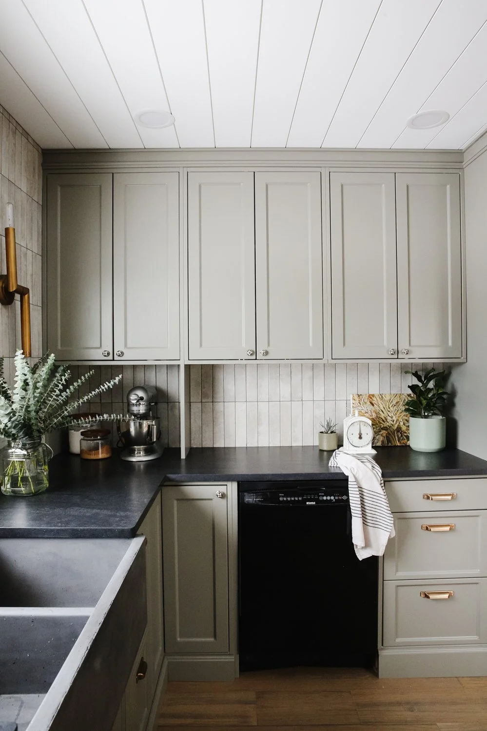 The cabinet colour here is Benjamin Moore ‘Desert Twilight’ 2137-40 and looks more green in some lights and more gray in others. I really love how it turned out and don’t think I’ll tire of it. Tip for choosing cabinet colours you’ll love: instead of looking to the ‘trends’, look to your wardrobe. This gray-green is a colour I find myself drawn to all the time and so I know it’s a safe bet for me.