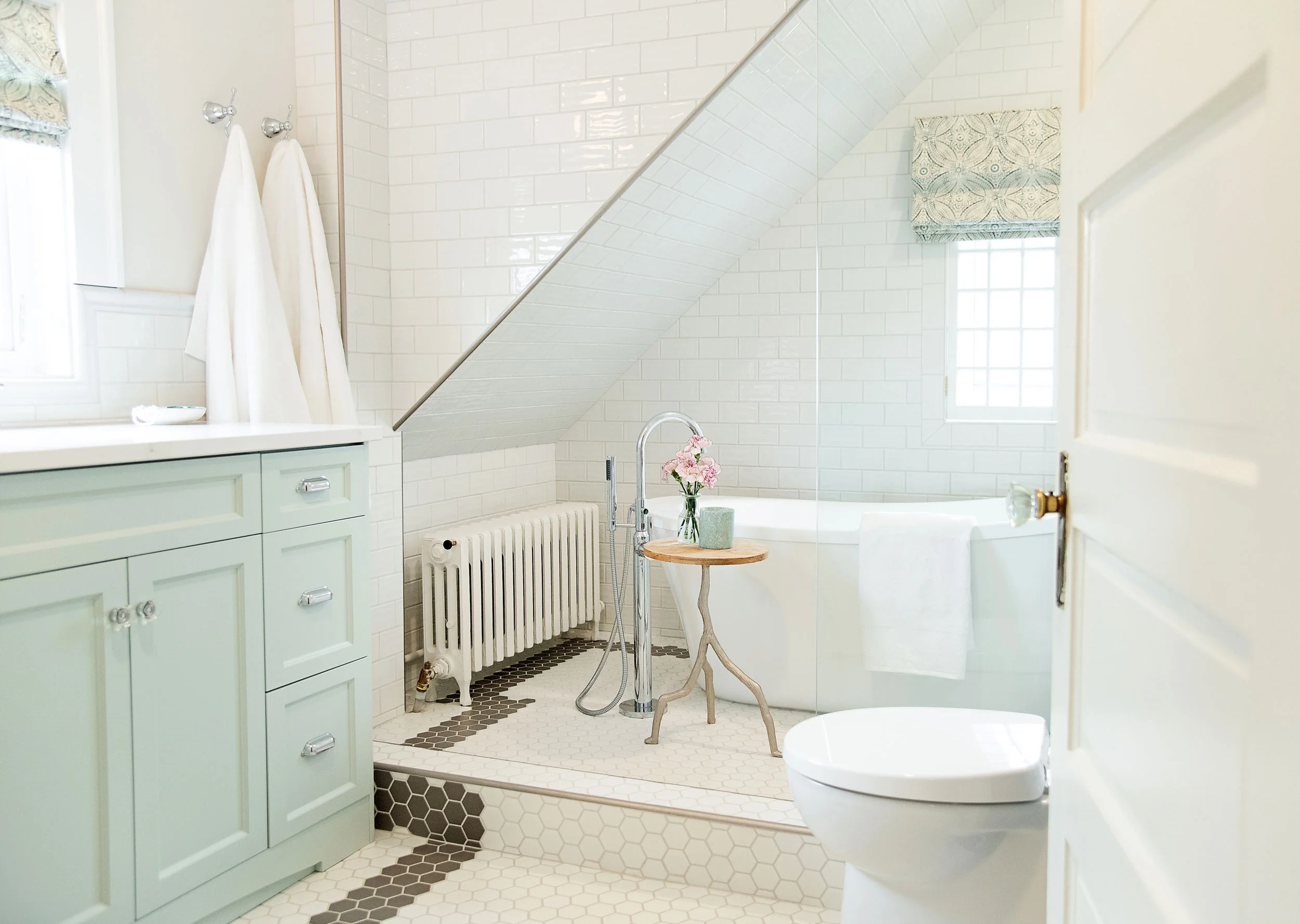 The master bath in this hundred-year-old home was completely transformed to suit our clients' taste while still honouring the home's heritage.